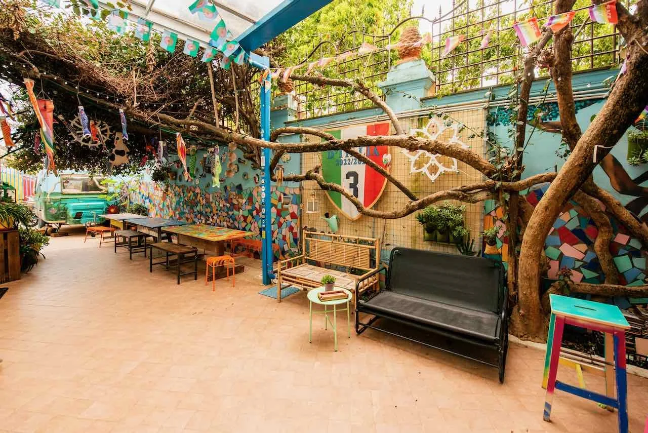 A communal terrace: a real gem of our hostel! Equipped with tables, chairs, and a fantastic mural, it is the perfect place to relax, sunbathe, chat with other guests, or enjoy a drink outside.